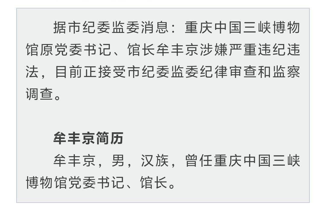 重庆中国三峡博物馆原党委书记、馆长牟丰京涉嫌严重违纪违法,目前正接受市纪委监委纪律审查和监察调查。